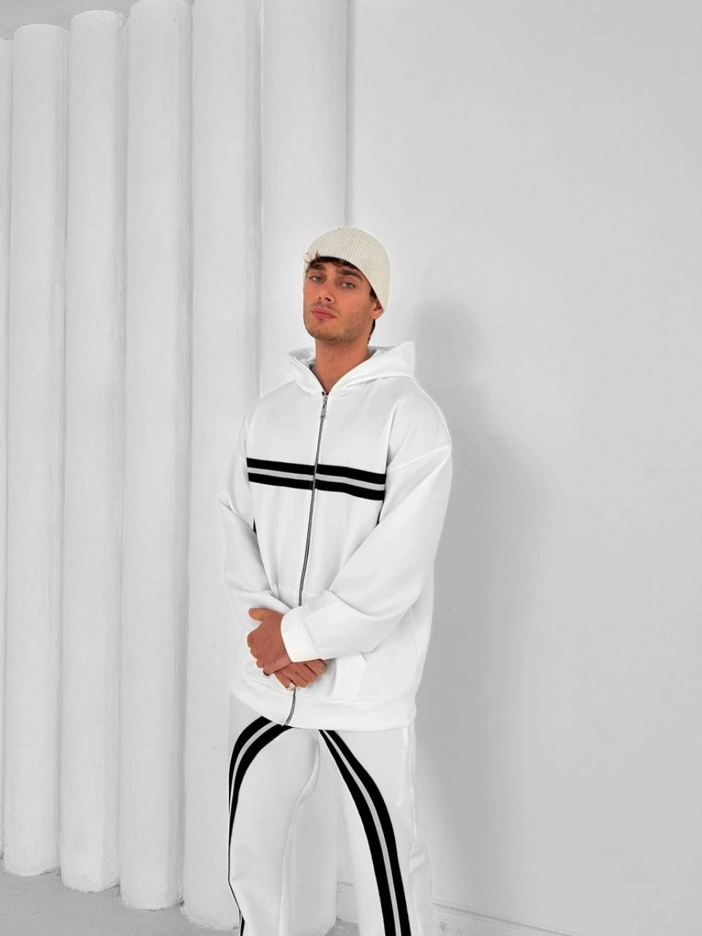 Reflektör Detaylı Maskeli Hoodie-Beyaz